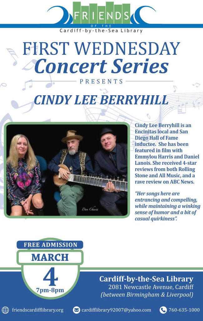 2 Nov 2016 First Wednesday Concert by admin | posted in: Events | 0 First Wednesday Concert Series Cindy Lee Berryhill March 4th, 7 pm – 8 pm Free Admission Community Room
